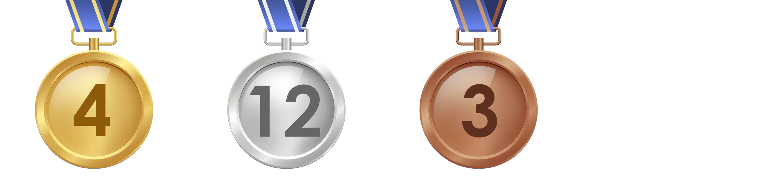 Quatro medalhas de ouro, 12 medalhas de prata e três medalhas de bronze.