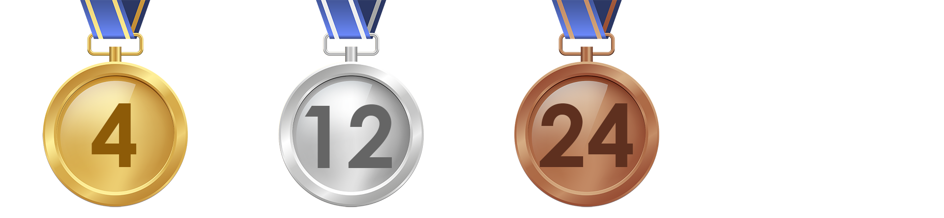 Quatro medalhas de ouro, 12 medalhas de prata e 24 medalhas de bronze.