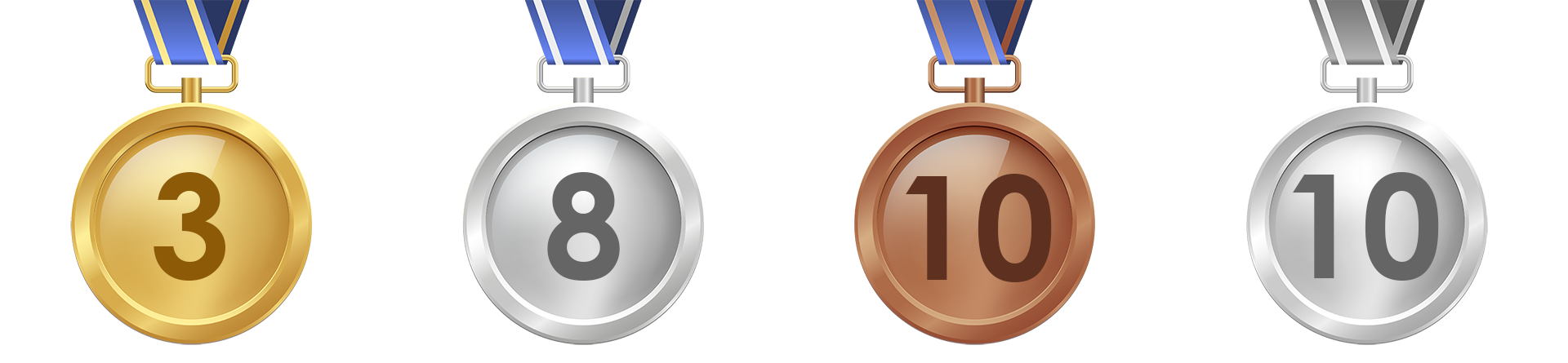 Três medalhas de ouro, oito medalhas de prata, dez medalhas de bronze e dez menções honrosas.