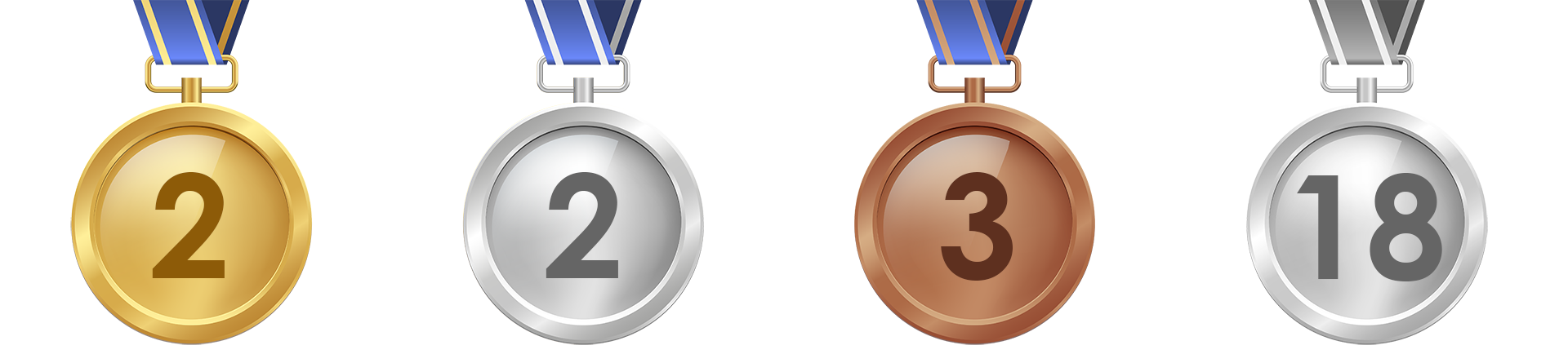 Duas medalhas de ouro, duas medalhas de prata, três medalhas de bronze e 18 menções honrosas.